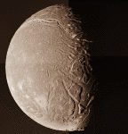 Ariel und Titania sind sich ausgesprochen ähnlich, obwohl Titania 35% größer ist. Alle größeren Uranusmonde bestehen aus einem Gemenge aus 40-50% Eis (=gefrorenem Wasser) und Felsen, ein wesentlich größerer Anteil Felsen als bei Saturns größeren Monden wie Rhea.